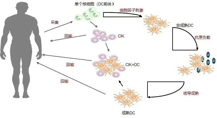 科學家研究發現,在人體免疫系統內,有兩種專門對付癌細胞的專項功能細胞(DC細胞和CIK細胞),但在人體內的含量極少,僅占1%左右,腫瘤患者體內的含量更少。科學家們經過刻苦攻關,成功從人體外周血中分離出這兩種細胞,通過專項實驗室培養后再回輸到患者體內,能系統殺滅癌細胞,防止轉移和擴散。