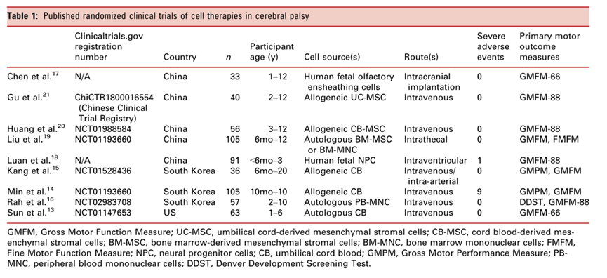 迄今為止的研究主要包括腦癱兒童的所有亞型和年齡[10,11]。這既是證據(jù)基礎(chǔ)的優(yōu)點(diǎn)也是缺點(diǎn)。一方面,細(xì)胞似乎對(duì)所有類型的腦癱都是安全的,但目前還不可能區(qū)分最佳反應(yīng)者和無反應(yīng)者。