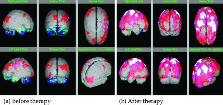 在我們的機構,患者接受了hESC治療作為主要治療。經過四次治療后,他的認知能力和溝通能力都有所提高。他的手眼協調能力得到了改善,言語能力也得到了改善,并且可以同時完成多項任務。他對嗅覺/聽覺刺激的過敏減輕了,身體變得強壯,免疫系統也得到了改善。治療后,2013年7月1日對他進行的SPECT掃描顯示腦灌注流量正常。在大腦和小腦區域觀察到的灌注程度顯著降低(圖2)。
