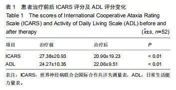 采用世界神經病聯合會國際合作共濟失調量表(ICARS)對患者治療前后神經功能進行評定,分值越高表示神經功能缺損越嚴重,采用日常生活能力量表(ADL)對患者治療前后的日常生活能力量進行評估,分值越低,日常生活能力越強。治療后對患者進行隨訪。