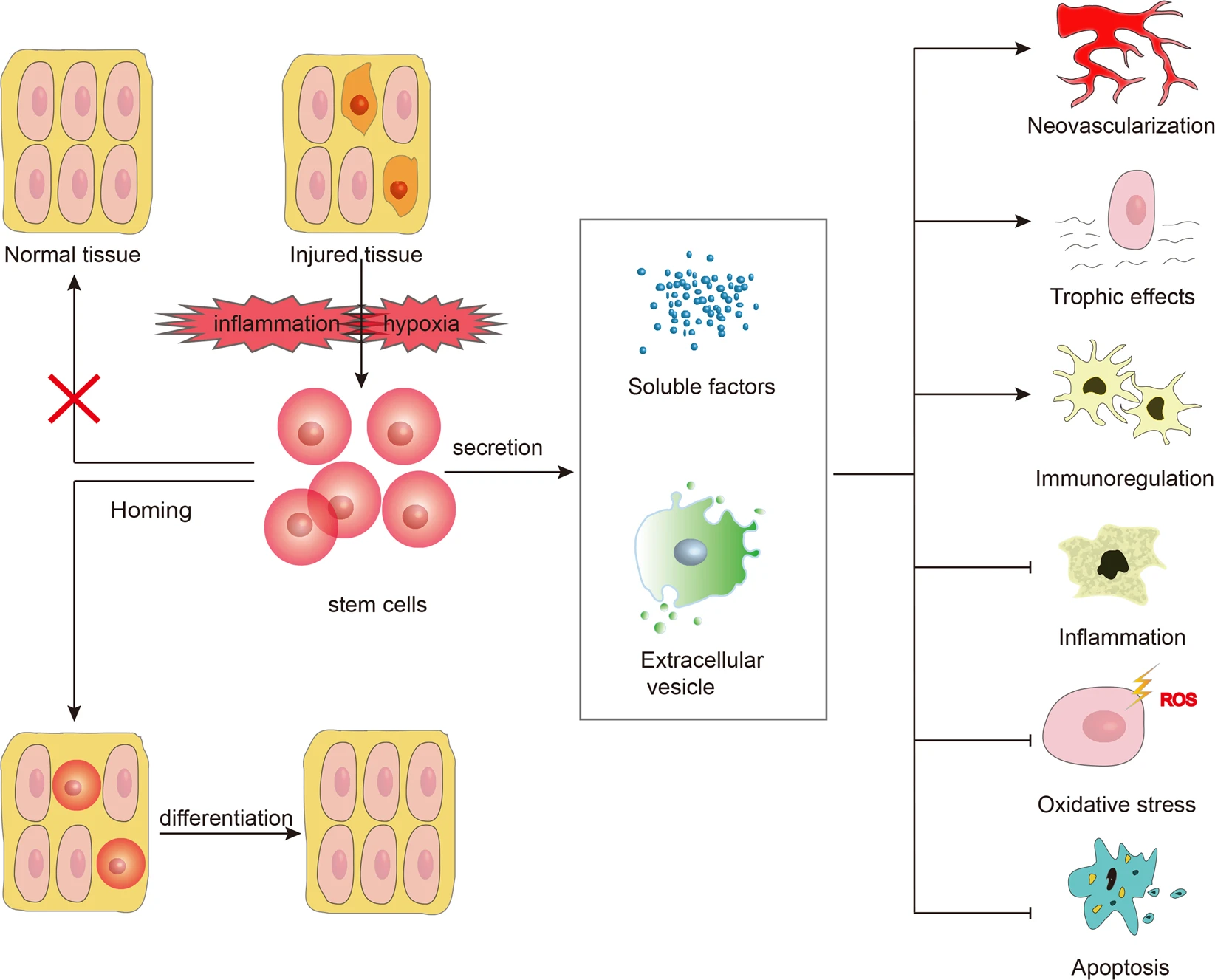 另一種是營養(yǎng)效應(yīng)(圖1)。 干細胞通過促進旁分泌、內(nèi)分泌或自分泌機制發(fā)揮作用,例如有絲分裂、新血管形成、抗炎、細胞保護、抗生產(chǎn)和免疫調(diào)節(jié)。