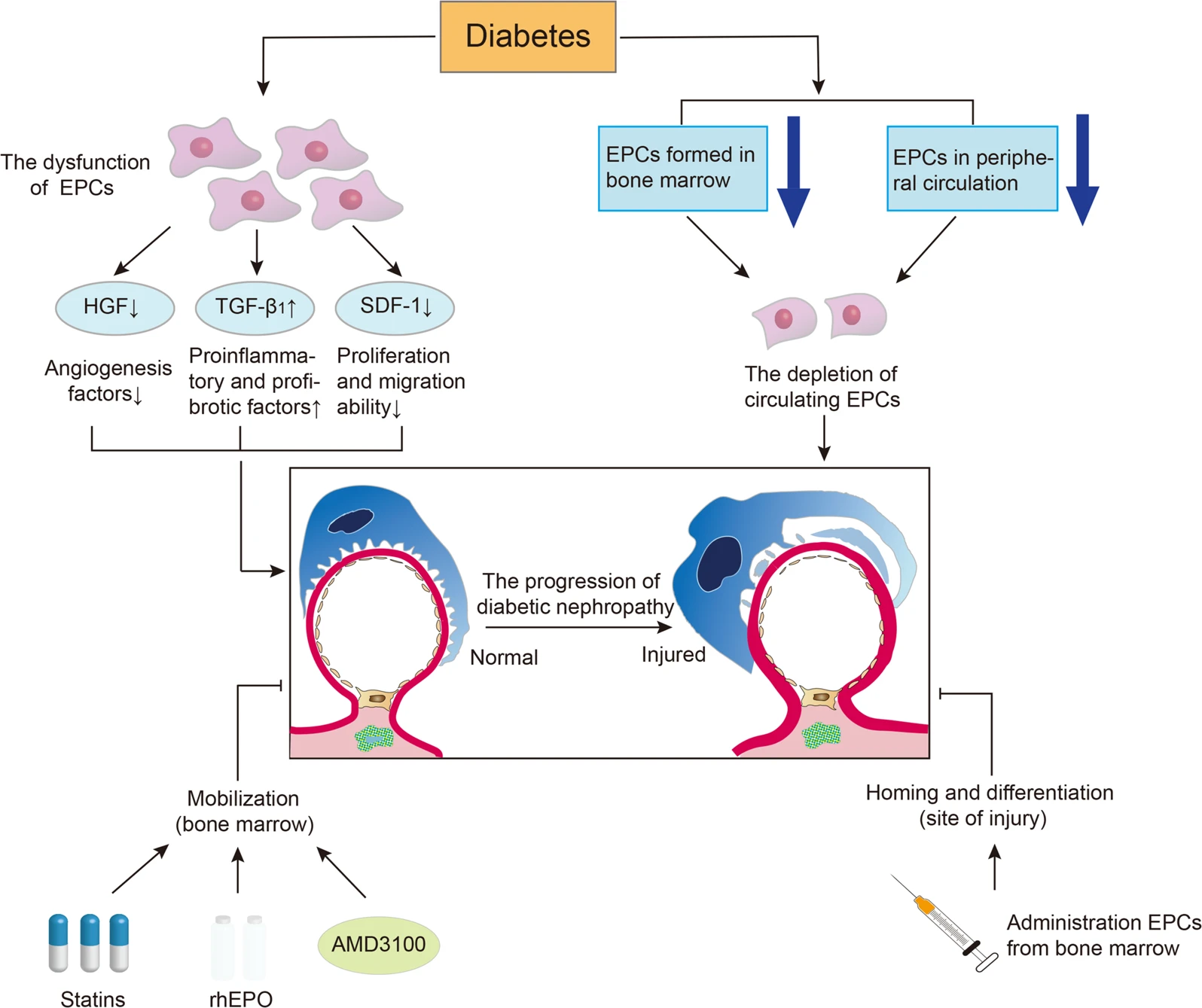 在糖尿病狀態(tài)下,內(nèi)皮祖細胞(EPCs)的旁分泌功能受損,EPCs中血管生成因子的表達和EPCs的增殖和遷移能力降低,而TGF-β1等促炎和促纖維化因子的分泌受到抑制。增加。此外,循環(huán)內(nèi)皮祖細胞的耗竭是由于骨髓中形成的內(nèi)皮祖細胞和外周循環(huán)中內(nèi)皮祖細胞的減少。糖尿病中EPCs循環(huán)水平降低和EPCs功能障礙可能導(dǎo)致糖尿病腎病(DN)的進展。相反,他汀類藥物、重組人促紅細胞生成素 (rhEPO) 和有效的 EPCs 動員劑 AMD3100 的給藥可以通過促進 EPCs 在骨髓中的動員來加速糖尿病患者傷口的愈合。此外,注射骨髓來源的EPCs能夠修復(fù)腎小球內(nèi)皮損傷,可能達到治療DN的目的。