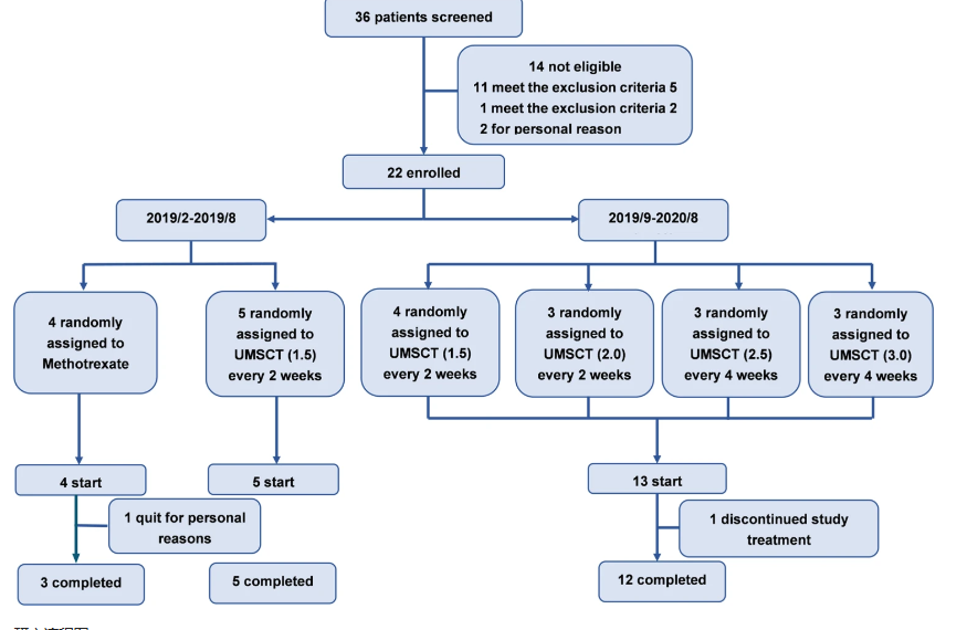 患者特征:2019年3月至2020年8月期間共納入32名患者。14名患者因個人原因不符合排除標準。共有18名患者入組并接受了UMSCT,其中17名患者根據(jù)臨床方案完成了UMSC輸注,1名患者停止了治療(圖1)。