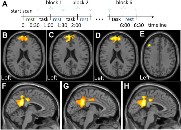 (A)fMRI 數據共分為6個區塊,每個區塊由雙任務和休息期組成。 丟棄第一個休息期(綠色表示)以確保達到T1平衡。 (B)治療前患者左額葉皮質的失活區-言語工作記憶環路前部成分的一部分。 失活簇包括Brodmann區9和10。(C) 干細胞注射后患者左右額葉皮質的失活區和(D)相應的差異圖像顯示失活體積顯著減少(P?<0.001)。(E) 治療后,Brodmann 區 9 的部分額葉皮質變為激活區。(F)左后扣帶回左側邊緣葉失活區治療前和治療后(G)體積均無變化(P?>0.05)。(H)然而,差值圖像顯示其定位發生了變化。