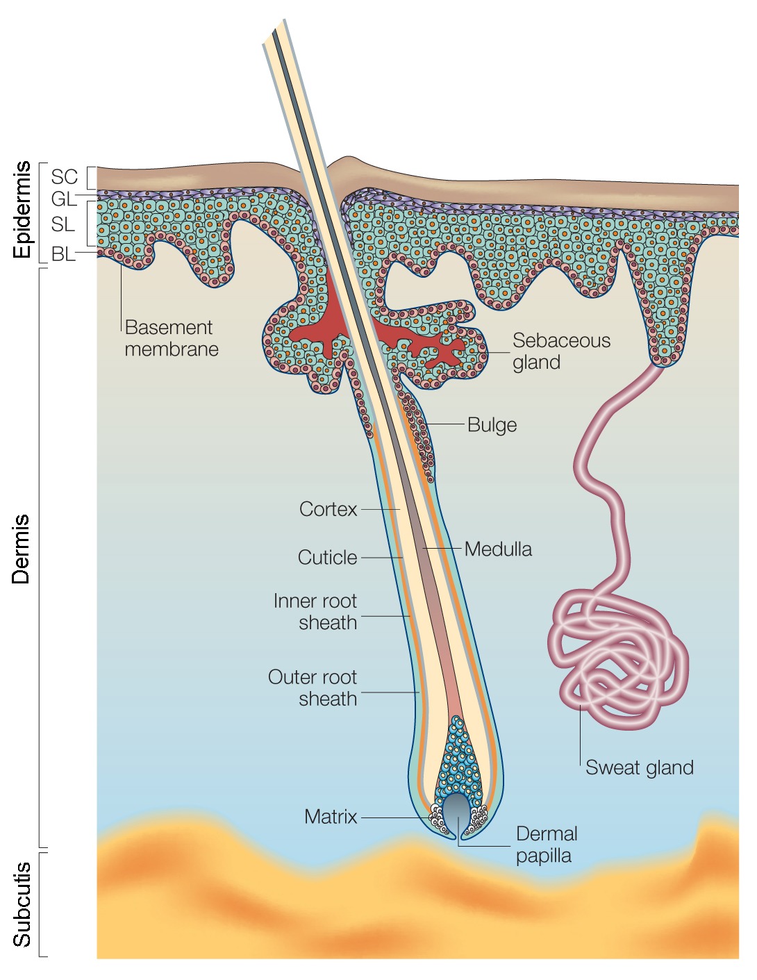 在人類和其他哺乳動物中,皮膚分為三部分 – 表皮、真皮和皮下組織(或皮下組織)。表皮形成皮膚的表面。它由幾層稱為角質形成細胞的細胞組成。真皮位于表皮之下,包含皮膚附屬物:毛囊、皮脂(油)腺和汗腺。皮下組織含有脂肪細胞和一些汗腺。