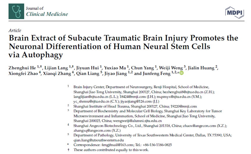 2022年,上海交通大學醫學院附屬仁濟醫院神經外科腦損傷中心、上海市顱腦創傷研究所、上海交大醫學院上海市腫瘤微環境與炎癥重點實驗室生物化學與分子細胞生物學系、上海安集協康生物技術股份有限公司、德克薩斯大學西南醫學中心病理學系聯合發表了關于人源神經干細胞治療創傷性腦損傷的科研新進展。