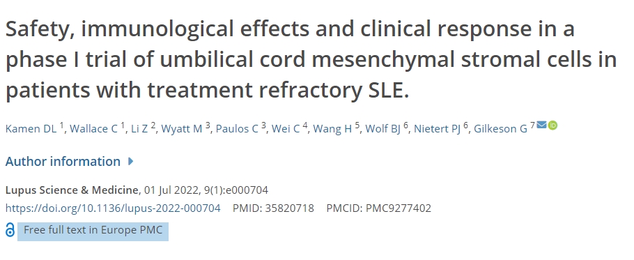 2022年,《狼瘡科學醫(yī)學》期刊雜志發(fā)表了一篇“臍帶間充質基質細胞治療難治性SLE患者的I期臨床試驗的安全性、免疫學效果和臨床反應”臨床研究的結果。