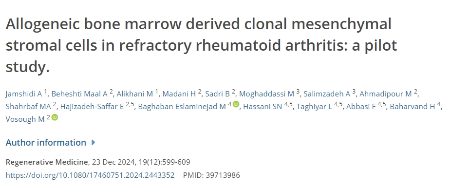 2024年,《再生醫(yī)學》雜志發(fā)表了一篇“同種異體骨髓衍生的克隆間充質基質細胞在難治性類風濕性關節(jié)炎中的應用:一項初步研究的結果”。