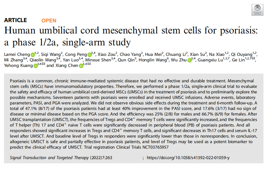 日前,中南大學湘雅醫(yī)院在Nature子刊《signal transduction and targeted therapy》發(fā)表干細胞治療銀屑病最新臨床研究結果。該臨床試驗揭示了人臍帶來源間充質干細胞對銀屑病患者是安全和有效的。