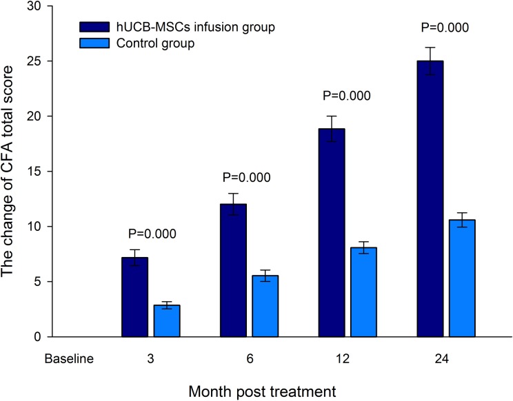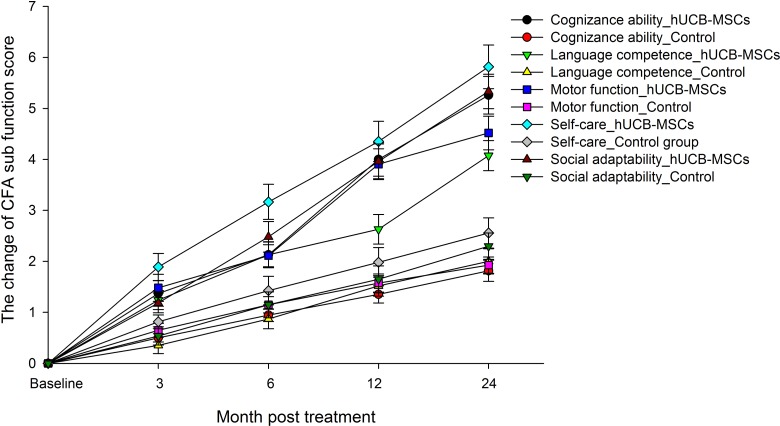一致地,與對照組相比,hUCB-MSC輸注組中各項功能的CFA評分變化顯著升高(圖4)。分數變化的基線水平設置為零。在hUCB-MSC輸注后3個月,所有5個功能區域的CFA評分均有改善的趨勢(圖4). 僅在治療后 24個月,對照組的評分變化有所改善(圖4)。