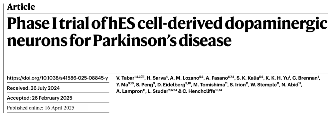2025年4月16日,美國紐約州紐約市紀念斯隆凱特琳癌癥中心神經外科部在自然期刊雜志上發表了一篇“Phase I trial of hES cell-derived dopaminergic neurons for Parkinson’s disease”。
