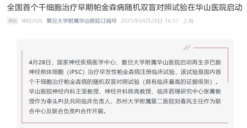 全國首個!華山醫院啟動干細胞治療早期帕金森病隨機雙盲對照試驗