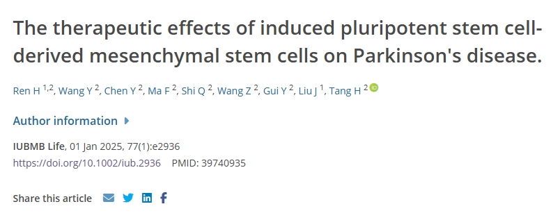 2025年1月1號,湖南大學化學化工學院進行了一項誘導多能干細胞衍生的間充質干細胞治療帕金森病小鼠模型的研究。該研究結果發表在“IUBMB Life”研究主頁。
