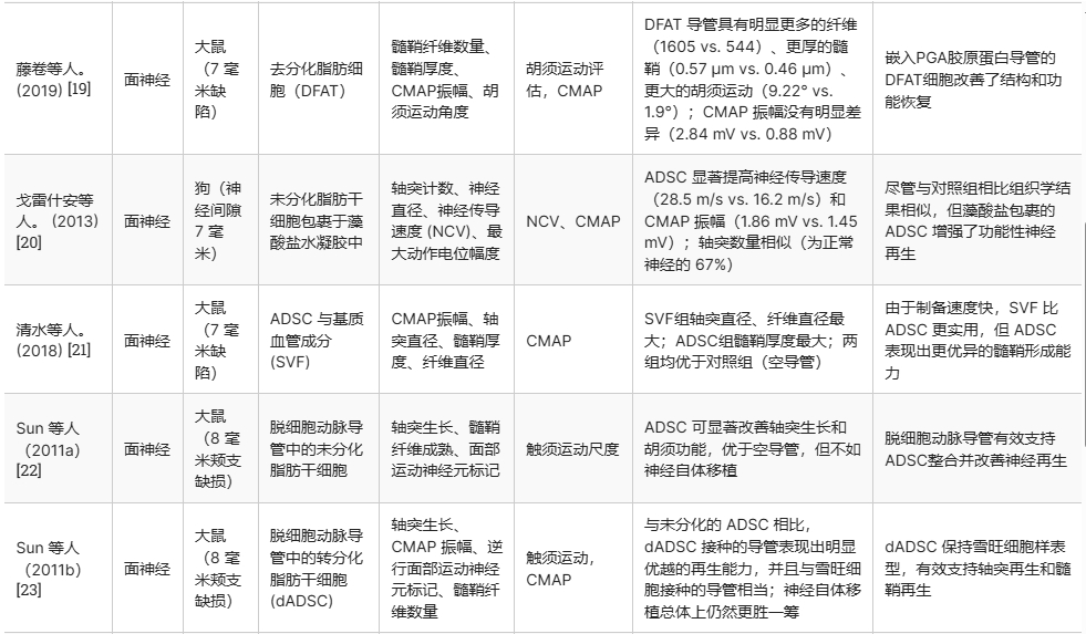 通過分析12篇相關(guān)研究(盡管主要為動(dòng)物實(shí)驗(yàn)),發(fā)現(xiàn)無論是ADSC還是dADSC治療,均顯示出改善神經(jīng)再生、促進(jìn)髓鞘形成、恢復(fù)肌肉神經(jīng)支配以及增強(qiáng)腦神經(jīng)功能的潛力。這些初步結(jié)果表明,ADSC在腦神經(jīng)損傷修復(fù)中可能扮演著重要角色。