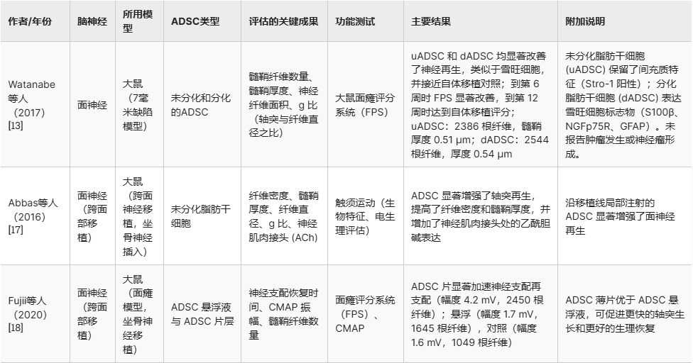 結(jié)論:脂肪干細(xì)胞(ADSC)作為神經(jīng)再生的潛在治療手段,其價(jià)值在長期研究中得到認(rèn)可。本綜述綜合現(xiàn)有證據(jù)(盡管以動(dòng)物研究為主)表明,ADSC治療能有效促進(jìn)顱神經(jīng)的結(jié)構(gòu)和功能恢復(fù)。