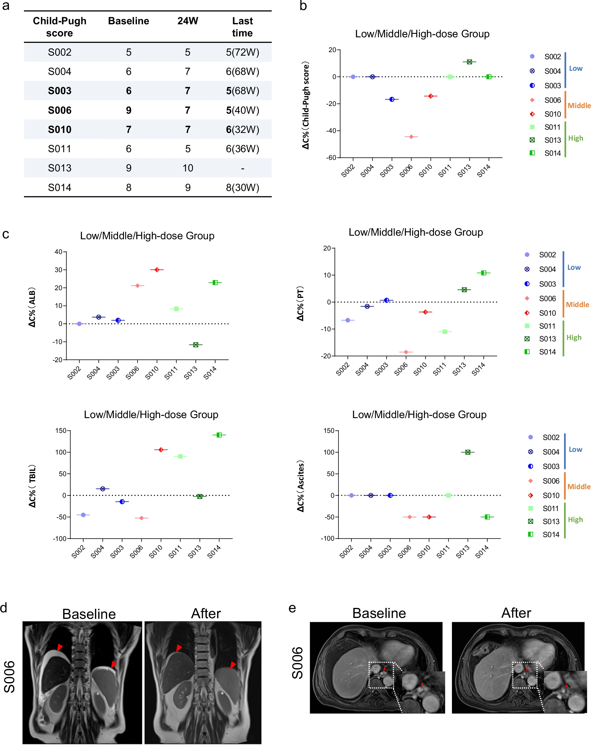 d.6號患者HepLPC治療前后的腹水情況。e.6號患者食管下端靜脈曲張血管直徑的變化。紅色方框內顯示的是肝硬化改善的指標。