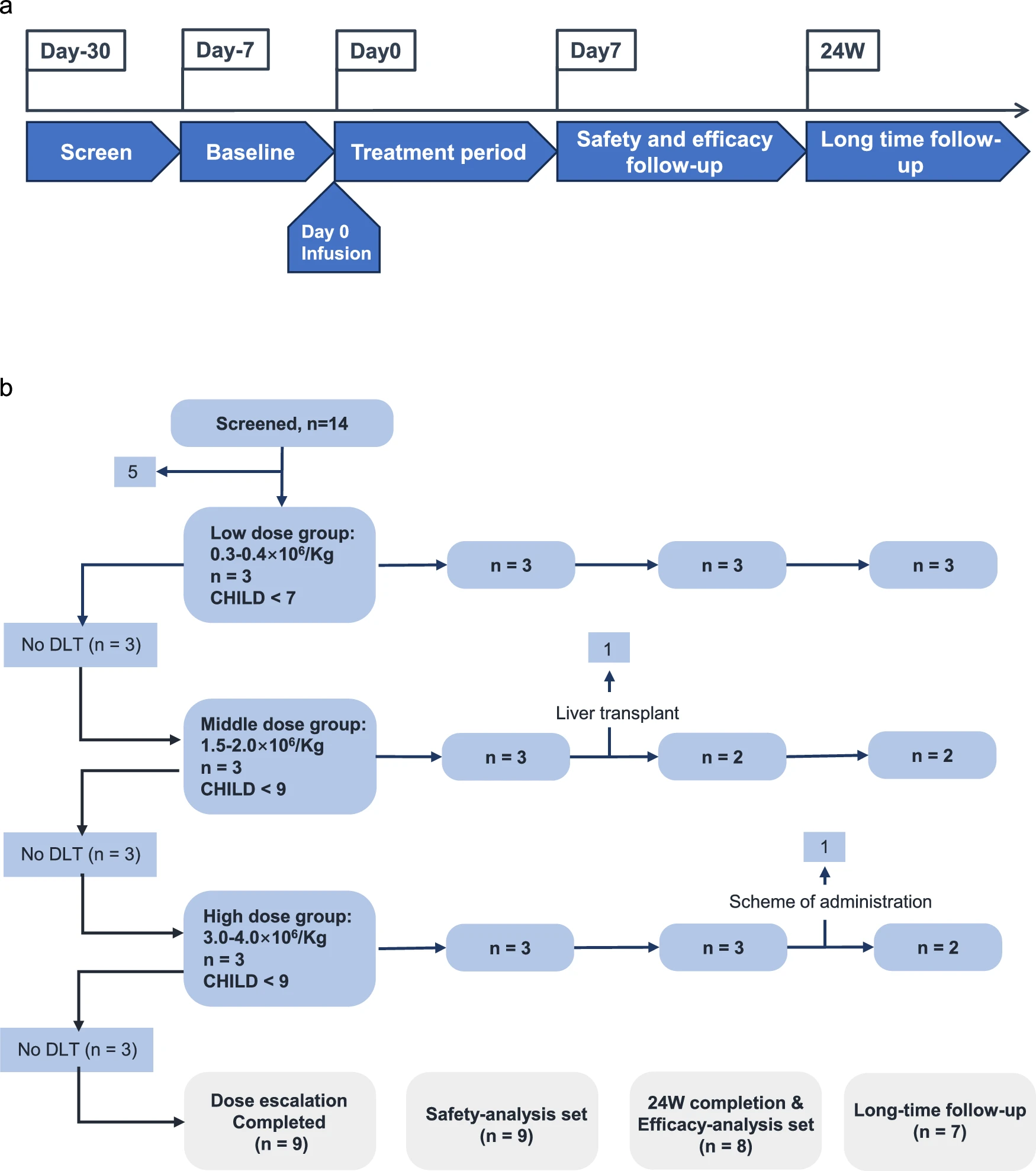 首先,在成功建立符合GMP規范的生產流程并證實其臨床前療效的基礎上,研究人員啟動了一項針對肝硬化患者的單臂、開放標簽臨床試驗,旨在評估HepLPCs療法在人體內的可行性與安全性。