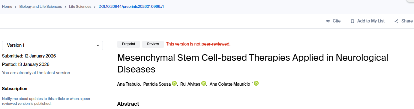 [1]:Trabulo, A.; Sousa, P.; Alvites, R.; Maurício, A. C. Mesenchymal Stem Cell-based Therapies Applied in Neurological Diseases. Preprints 2026, 2026010966. https://doi.org/10.20944/preprints202601.0966.v1