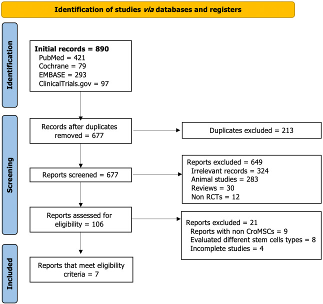 圖1:研究選擇流程圖(PRISMA 圖表)。RCT:隨機(jī)對(duì)照試驗(yàn);Cryo-MSC:冷凍保存的間充質(zhì)干細(xì)胞。