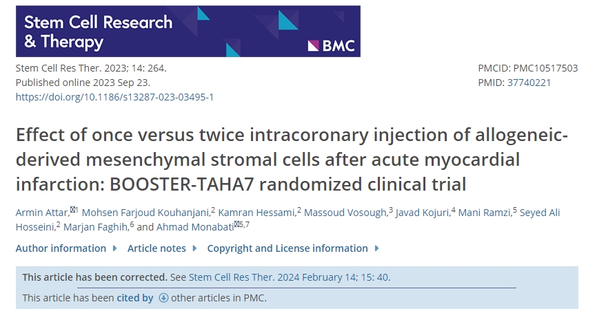 2023年,期刊《Stem Cell Research&Therapy》刊發(fā)一篇有關(guān)“急性心肌梗死后冠狀動(dòng)脈內(nèi)注射一次與兩次同種異體來源的間充質(zhì)基質(zhì)細(xì)胞的效果:BOOSTER-TAHA7隨機(jī)臨床試驗(yàn)”[2]。