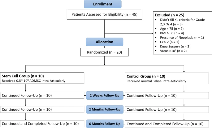 方法:這項三盲介入性臨床試驗納入了20例符合美國風濕病學(xué)會 (ACR) 標準的特發(fā)性膝關(guān)節(jié)骨關(guān)節(jié)炎 (OA) 患者?;颊弑浑S機分配接受關(guān)節(jié)內(nèi)注射0.5×108個同種異體ADMSC或生理鹽水(對照組)。