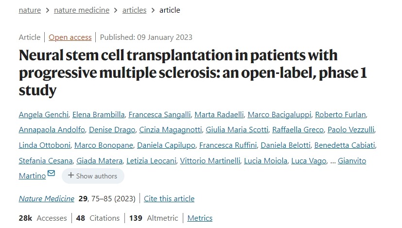 Genchi, A., Brambilla, E., Sangalli, F.?et al.?Neural stem cell transplantation in patients with progressive multiple sclerosis: an open-label, phase 1 study.?Nat Med?29, 75–85 (2023). https://doi.org/10.1038/s41591-022-02097-3