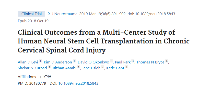 2019年3月19日,邁阿密大學米勒醫學院在國際期刊《Journal of Neurotrauma》上發布了一篇《人類神經干細胞移植治療慢性頸脊髓損傷的多中心研究的臨床結果》的研究結果。