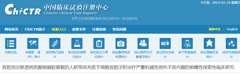 據(jù)悉,該項(xiàng)研究注冊(cè)號(hào)為ChiCTR2400080588,注冊(cè)日期為2024年2月1日,旨在評(píng)估宮腔用交聯(lián)透明質(zhì)酸鈉凝膠搭載的人臍帶間充質(zhì)干細(xì)胞宮腔移植治療對(duì)中重度宮腔粘連及薄型內(nèi)膜患者的有效性和安全性。