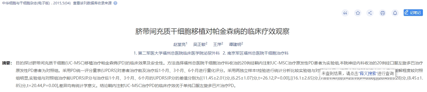 2015年,第二軍醫(yī)大學福州總醫(yī)院發(fā)表了一篇臍帶間充質(zhì)干細胞移植對帕金森病的臨床療效觀察的文章。