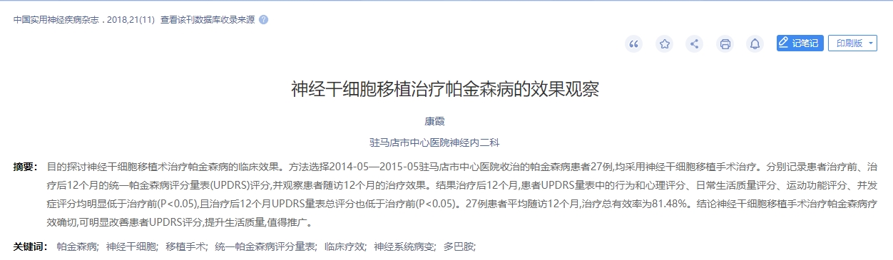 2018年,河南駐馬店市中心醫(yī)院神經(jīng)內(nèi)二科發(fā)表了神經(jīng)干細胞移植治療帕金森病的效果觀察的文章。