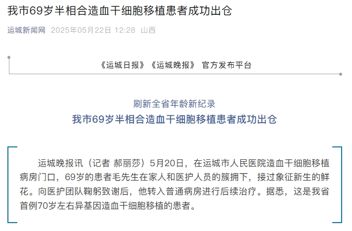 69歲白血病患者??(山西運城):半相合異體移植+間充質干細胞輔助,??總費用28萬??(醫保報銷后自付15萬)。