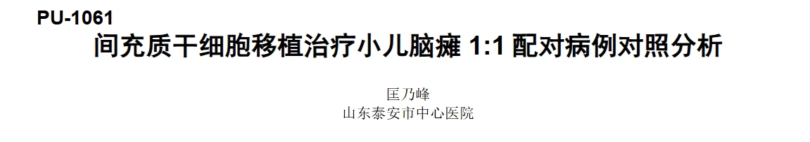 山東泰安市中心醫院曾在《中華醫學會第二十次全國物理醫學與康復學學術會議》上發表了一項《間充質干細胞移植治療小兒腦癱1:1配對病例對照分析》的臨床試驗。分析和總結應用骨髓間充質干細胞對腦癱患兒的運動功能療效。