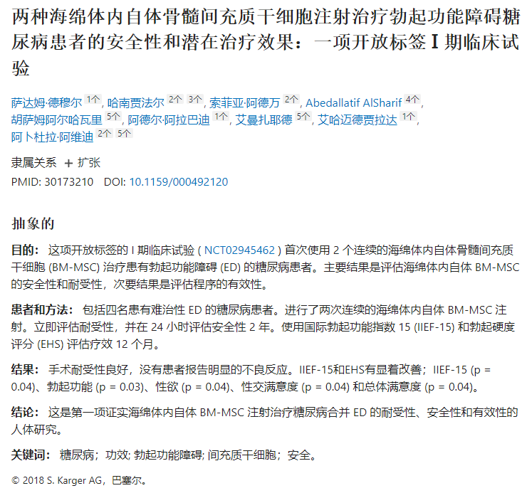 2010年,Bahk等人對7名年齡在57-87歲的糖尿病患者進行了一項研究,并將干細胞治療的效果與接受單獨PDE5抑制劑等ED治療的3名患者進行了比較。使用的干細胞是臍帶來源的間充質干細胞,劑量為1.5×107個細胞,經體內給藥。這項研究隨訪了9個月,在研究結束時,發現干細胞對ED產生了積極影響,如IIEF-5、SEP、GAQ和勃起日記的改善所示。