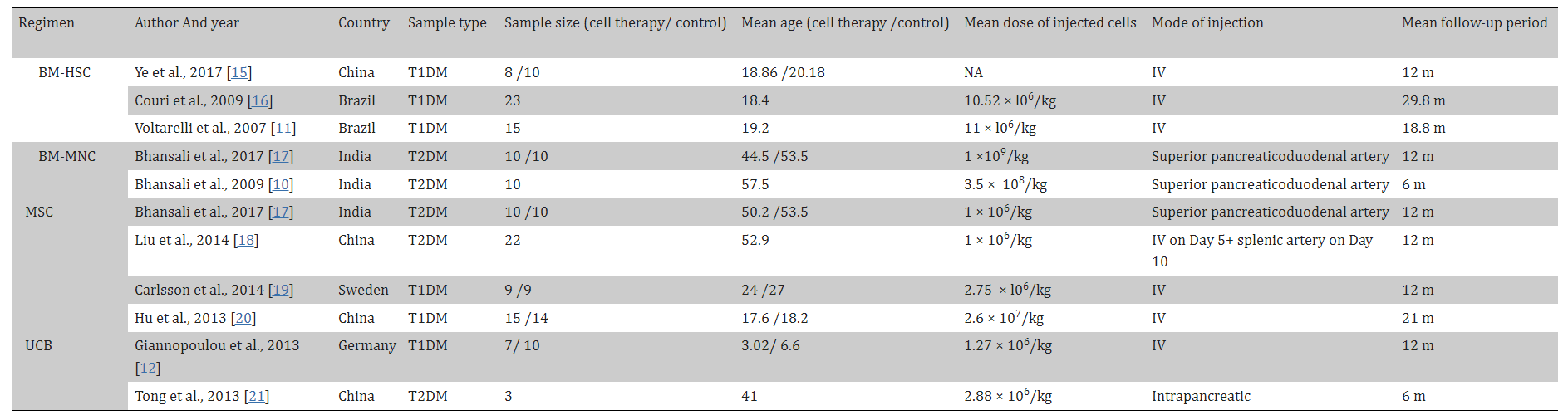 值得注意的是,只有五項(xiàng)研究包括接受安慰劑或胰島素的對(duì)照組,以及接受干細(xì)胞移植的治療組。隨訪期從六個(gè)月到29.8個(gè)月不等。