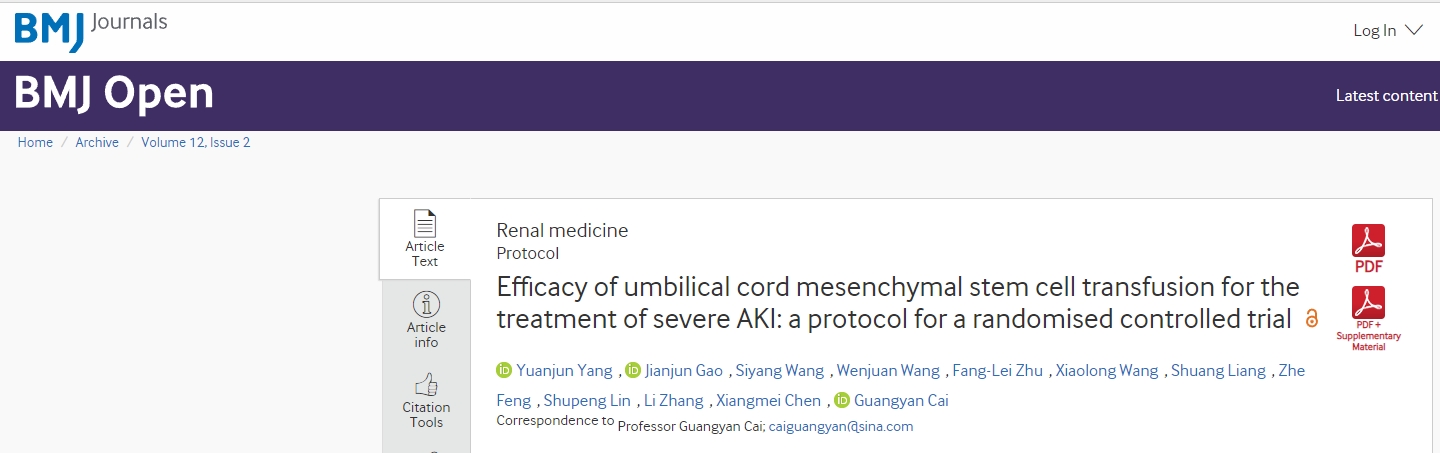 最近兩年,期刊雜志《BMJ》發表了一篇“臍帶間充質干細胞輸注治療嚴重急性腎損傷的療效:一項隨機對照試驗方案”的文章,本試驗研究了MSC是否可以改善嚴重AKI患者的腎臟恢復和死亡率。