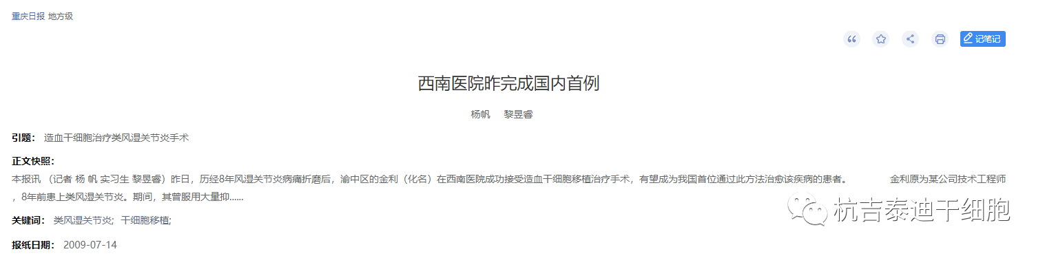 2009年,西南醫(yī)院完成了國(guó)內(nèi)首例造血干細(xì)胞移植治療類風(fēng)濕關(guān)節(jié)炎的臨床試驗(yàn)。