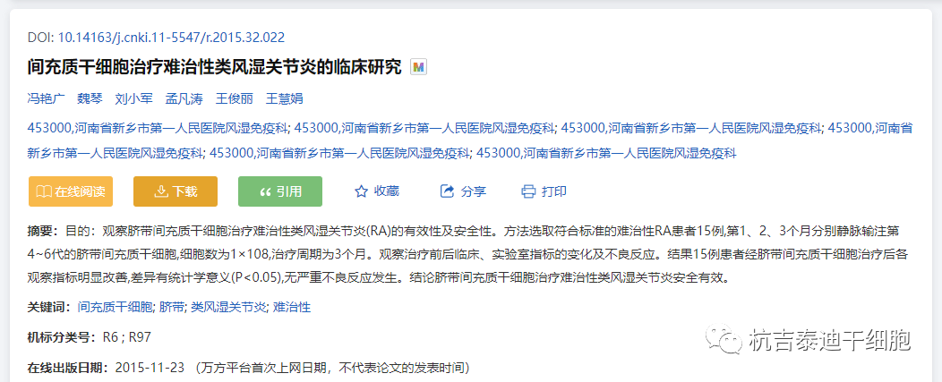 結(jié)論:臍帶間充質(zhì)干細(xì)胞治療難治性類風(fēng)濕關(guān)節(jié)炎安全有效。