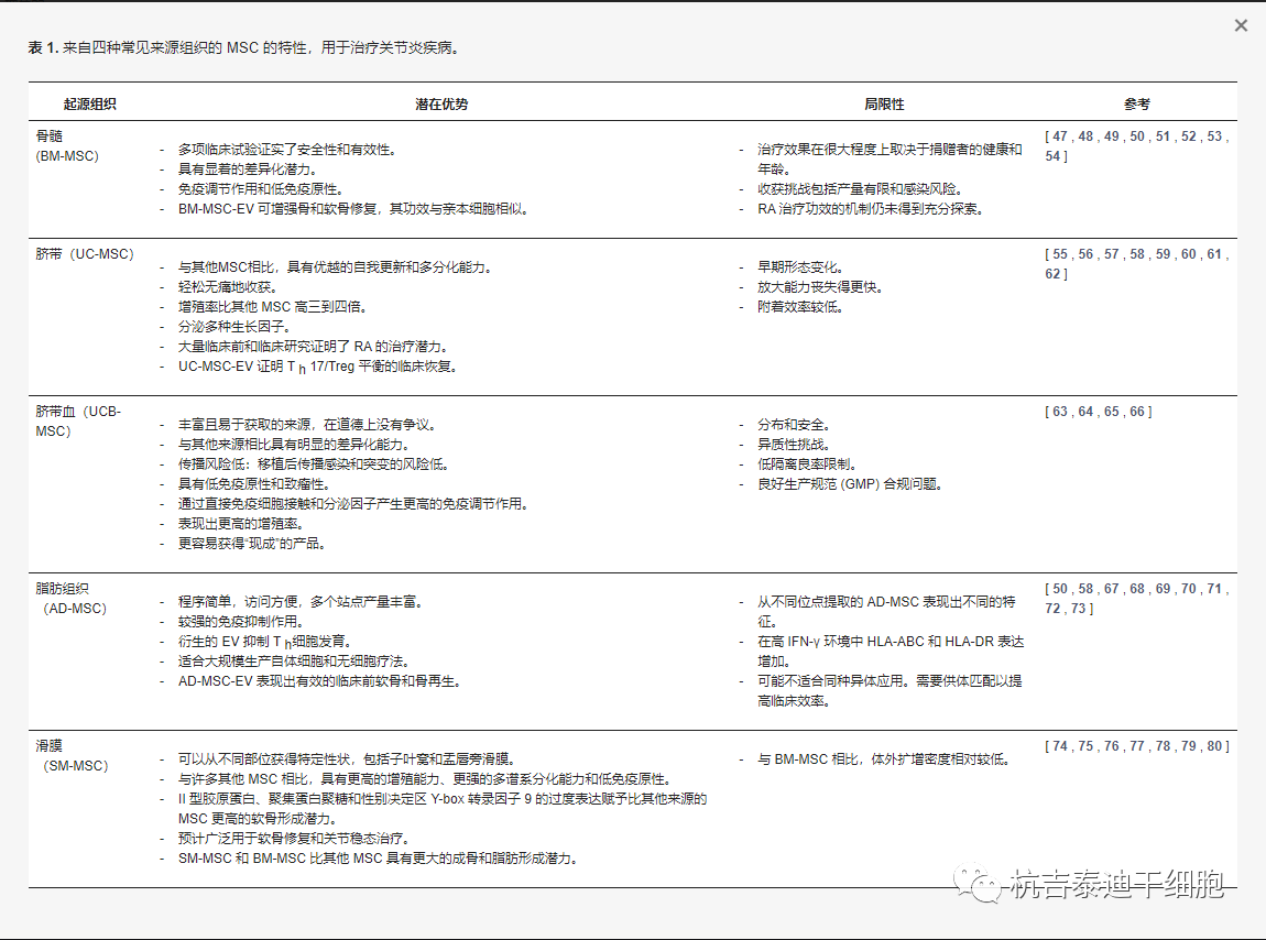 表1:來自四種常見來源組織的MSC的特性,用于治療關節炎疾病。
