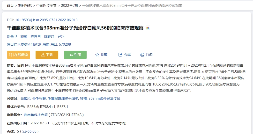 2022年,《中國(guó)醫(yī)療美容》期刊發(fā)表了一篇《干細(xì)胞移植術(shù)聯(lián)合308nm準(zhǔn)分子光治療白癜風(fēng)56例的臨床療效觀察》的文章,目的:探討干細(xì)胞移植術(shù)聯(lián)合308nm準(zhǔn)分子光治療白癜風(fēng)的臨床應(yīng)用效果,分析其臨床應(yīng)用價(jià)值。