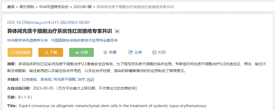 2022年,中華風(fēng)濕病學(xué)雜志發(fā)表了《異體間充質(zhì)干細(xì)胞治療系統(tǒng)性紅斑狼瘡專(zhuān)家共識(shí)》,文章概述了多項(xiàng)臨床研究已證實(shí)間充質(zhì)干細(xì)胞治療SLE患者安全且有效。為了規(guī)范間充質(zhì)干細(xì)胞的臨床應(yīng)用,專(zhuān)家組對(duì)間充質(zhì)干細(xì)胞治療SLE的適應(yīng)證、用法、輸注次數(shù)及細(xì)胞數(shù)、輸注前用藥以及輸注后合并用藥,以及在合并妊娠、感染和腫瘤等情況時(shí)的應(yīng)用制定了推薦意見(jiàn)。