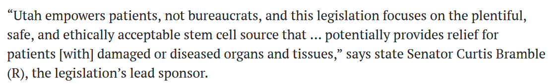 猶他州參議員Curtis Bramble (R)是這項(xiàng)法案的主要發(fā)起人,他表示:猶他州將權(quán)利下放到患者本人,而非政府工作人員,法案通過的是豐富的、安全的、倫理可接受來源的干細(xì)胞,能夠?yàn)榻M織器官受損的患者提供治療。