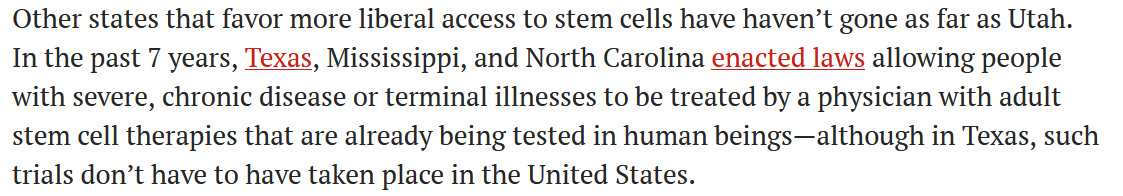 在過去7年,德克薩斯州、密西西比州和北卡羅來納州頒布了法律,允許患有嚴(yán)重、慢性疾病或晚期疾病的患者由醫(yī)生使用成人干細(xì)胞療法進(jìn)行治療,這種療法已經(jīng)在人體中進(jìn)行了測試,但這種試驗(yàn)不需要在全美國進(jìn)行。