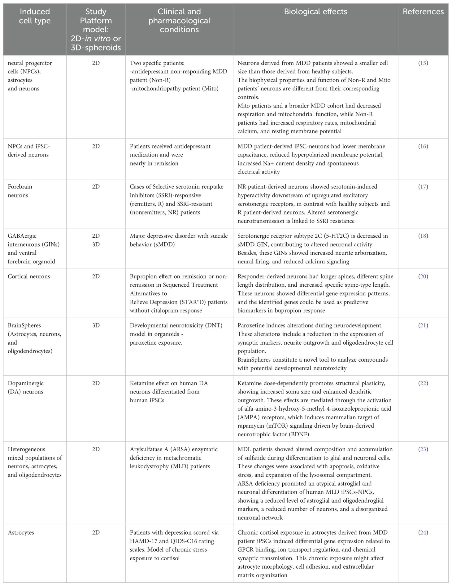 盡管如此,迫切需要開發(fā)新的平臺來闡明人類神經(jīng)元和非神經(jīng)元細(xì)胞在抑郁癥中的行為方式,并進一步理解其病理生理學(xué)。對源自抑郁癥患者iPSC的人類神經(jīng)元、神經(jīng)膠質(zhì)細(xì)胞和其他非神經(jīng)元細(xì)胞的研究已證明它們有潛力闡明抑郁癥的細(xì)胞和分子方面,從而有助于詳細(xì)了解這種疾病。