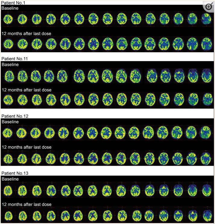 PET/CT檢測18F-FDG的SUV,探索局部腦糖代謝。作為一項可選評估,由對照組8名患者和hUC-MSC組5名患者完成。在最后一次訪問時測量大腦區域的平均SUV,并與個體的基線水平進行比較。結果,在臍帶間充質干細胞移植后,3名患者的所有大腦區域的SUV均增加了50%以上(表中的11、12和13號患者) 表5和圖4)。此外,在對照組中未觀察到顯著變化。