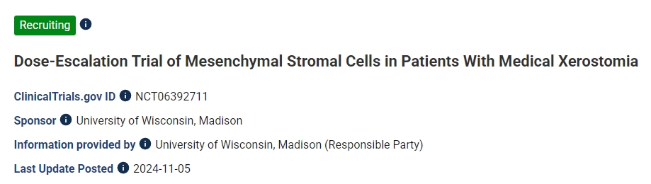 作為1期研究(NCT06392711)的一部分,六名患者將自身的間充質(zhì)基質(zhì)細(xì)胞(一種成體干細(xì)胞)注射到單個主要唾液腺中。若從每位患者骨髓中采集的1000萬個間充質(zhì)基質(zhì)細(xì)胞劑量耐受性良好,后續(xù)將注射到雙側(cè)頜下腺。口干癥是干燥綜合征的標(biāo)志性癥狀,由唾液腺受損引起。