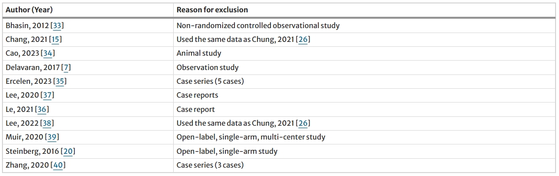 納入研究的特征和質量評估分別詳見表2和表3。共納入190例患者,其中治療組115例,對照組75例。治療方式包括自體間充質干細胞(n=2)和 G-CSF(n?=2)刺激以增加干細胞。綜述中納入的文章來自韓國、法國、英國和臺灣。所有研究的平均年齡為63.15歲,范圍從53歲到76歲。