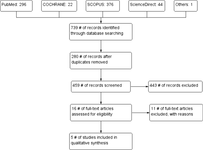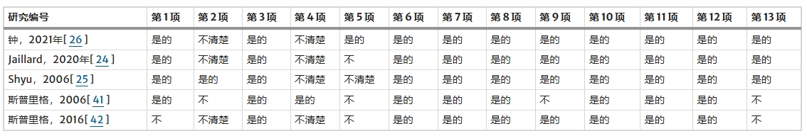 結果:采用上述檢索策略,我們共檢索到739篇文章。刪除280條重復記錄后,剩余459篇文章。進一步篩選后,共排除443篇文章。隨后,對16篇文章進行了全文檢索,其中排除11篇,排除原因詳見表1。此外,通過對已納入的5篇文章進行引文檢索,又找到1篇文章,最終共計6篇文章可供定性綜合。