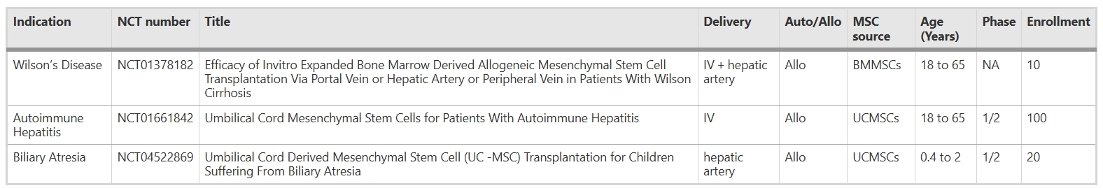 目前,MSC療法正在臨床試驗中探索其治療各種慢性肝病的潛力,包括威爾遜氏病、自身免疫性肝炎和膽道閉鎖,并針對每種情況制定具體的給藥策略(表格3)。