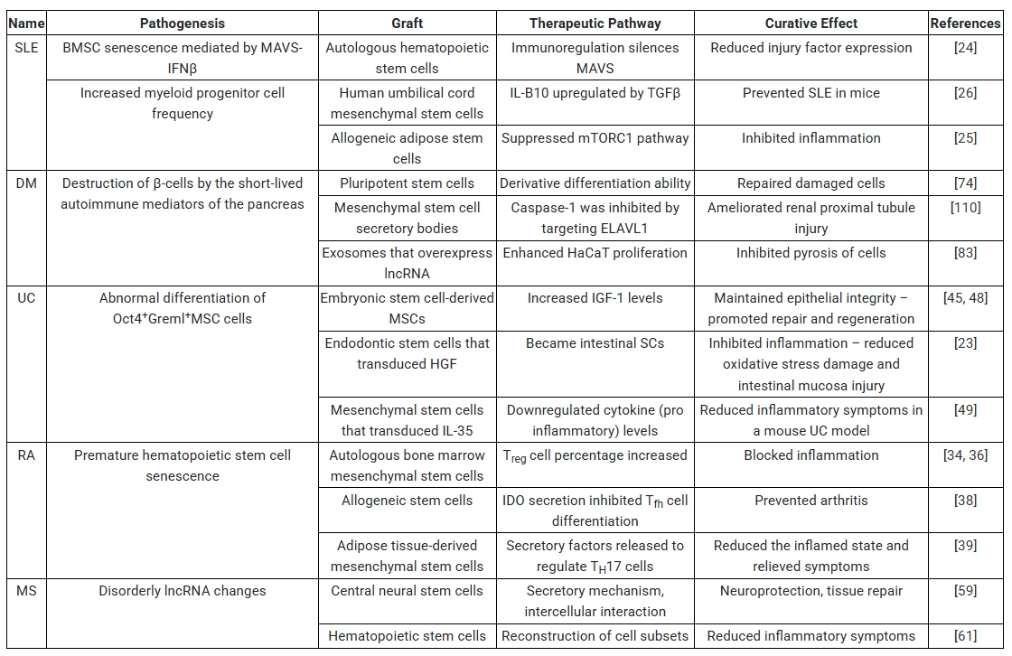 自身免疫性疾病(AID)在全球人群中發病率較高。由于目前尚無針對各類AID的特效治療方案,這給艾滋病患者帶來了沉重的經濟負擔和心理負擔。因此,尋找新的有效治療方法仍然是臨床迫切需要。干細胞研究已發展成為一個可能為多種AID治療提供新方法的領域。事實上,一些典型的AID,例如系統性紅斑狼瘡(SLE)、潰瘍性結腸炎(UC)和糖尿病(DM),已被證明在接受干細胞移植治療后,病情均有不同程度的緩解(表1)。