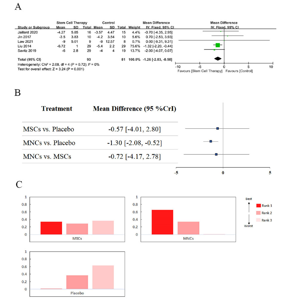 (A) 直接薈萃分析中 mRS 評分變化的森林圖。(B) 網絡薈萃分析中 mRS 評分變化的森林圖。(C) 不同類型干細胞移植的排序位置。MSCs 和 MNCs 的 SUCRA 分別為98%和26%。